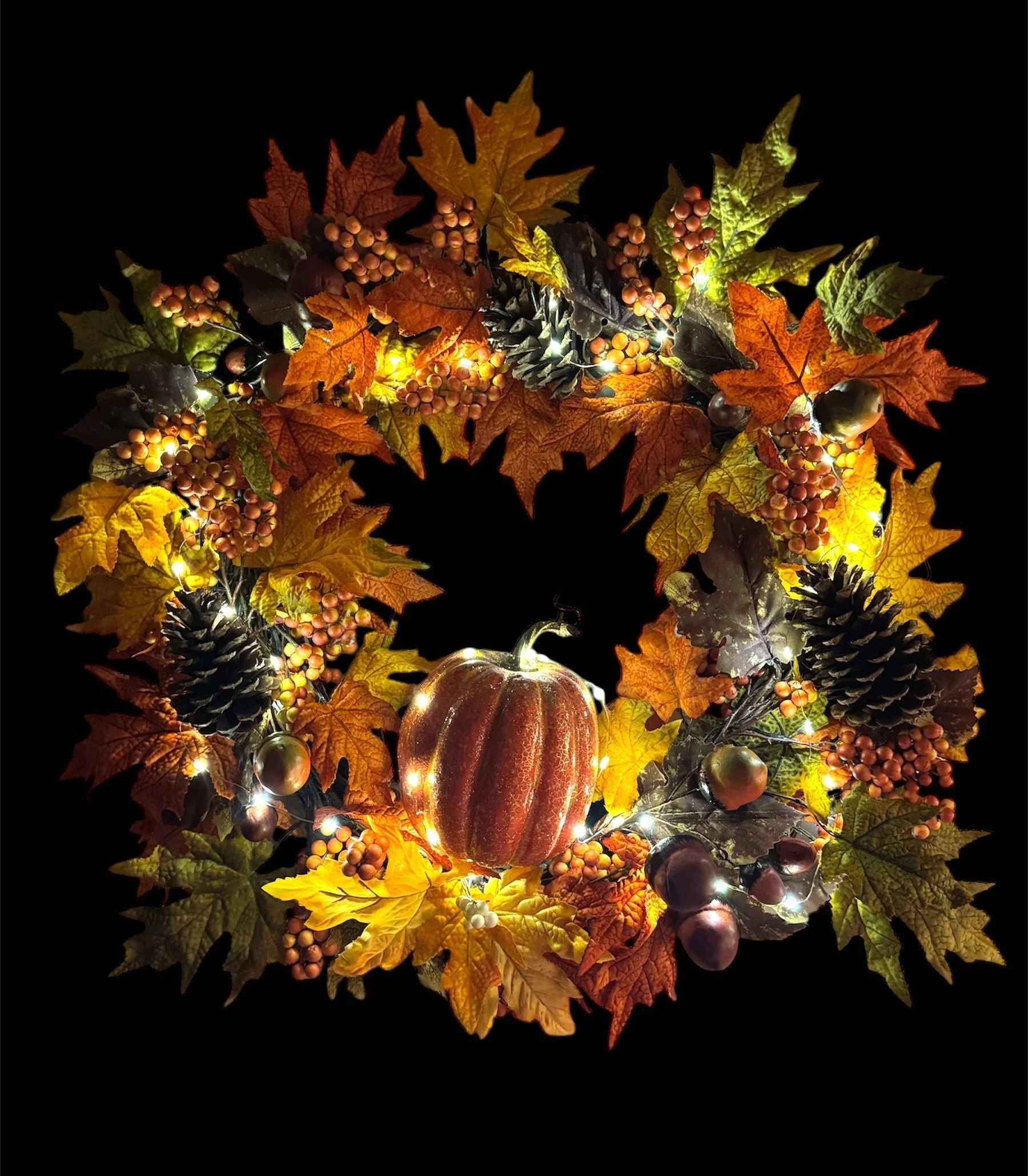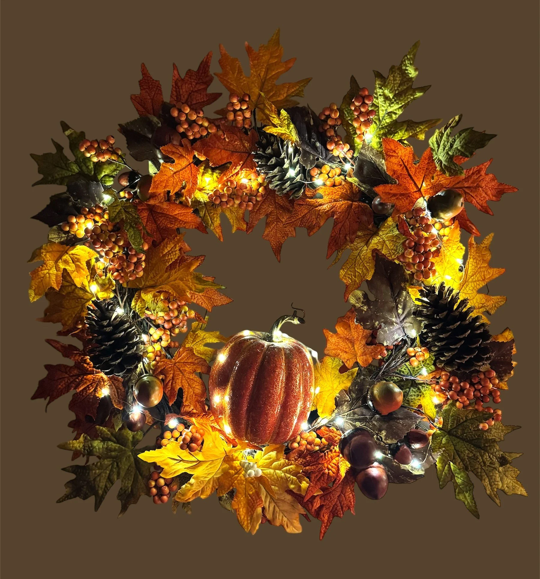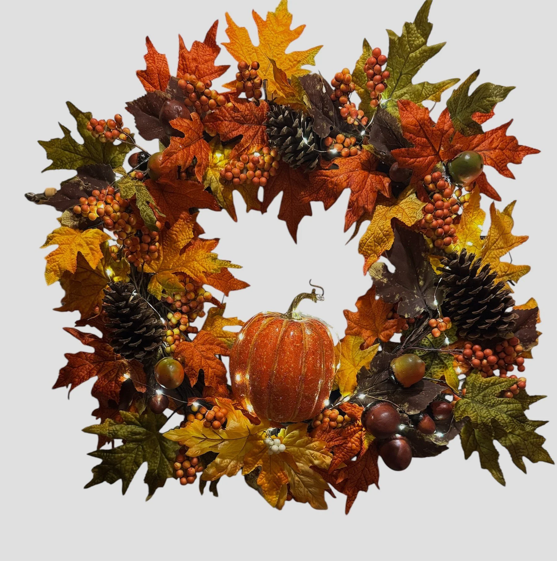 This multi-directional 18" grapevine wreath features a black and white buffalo plaid ribbon, adorned with pumpkins and accented with fall leaves and hydrangeas, making it a perfect addition to your seasonal décor.
